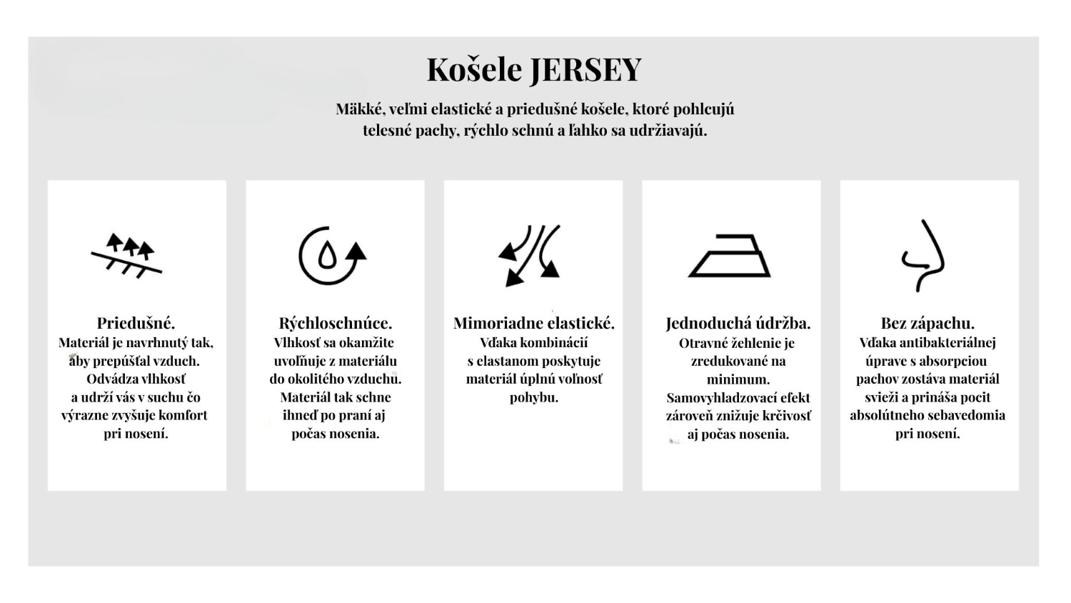 Tu nájdete elastické Jersey košele. Košele v ktorých sa budete cítiť ako v bavlnke. Vzhľad košele, ale pohodlie trička. Vďaka unikátnej priadzi s vysokým obsahom bavlny s prímesou elastanu sú tieto košele elastické vo všetkých smeroch, materiál je rýchloschnúci, pohlcujúci zápach, ľahko sa žehlí. Košele majú všestranné využitie: biznis, voľný čas, slávnostné chvíle (pre tieto odporúčame biele).